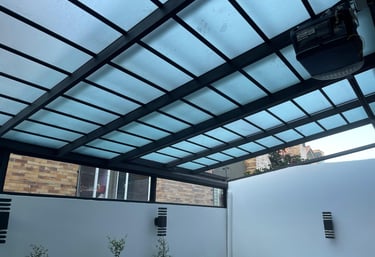 Proyecto en norte de Quito - pérgola metálica corrediza con vidrio al ácido